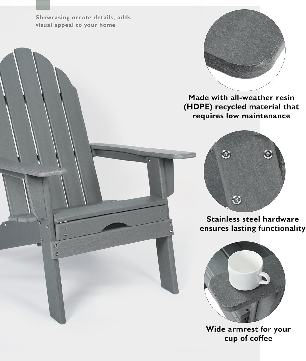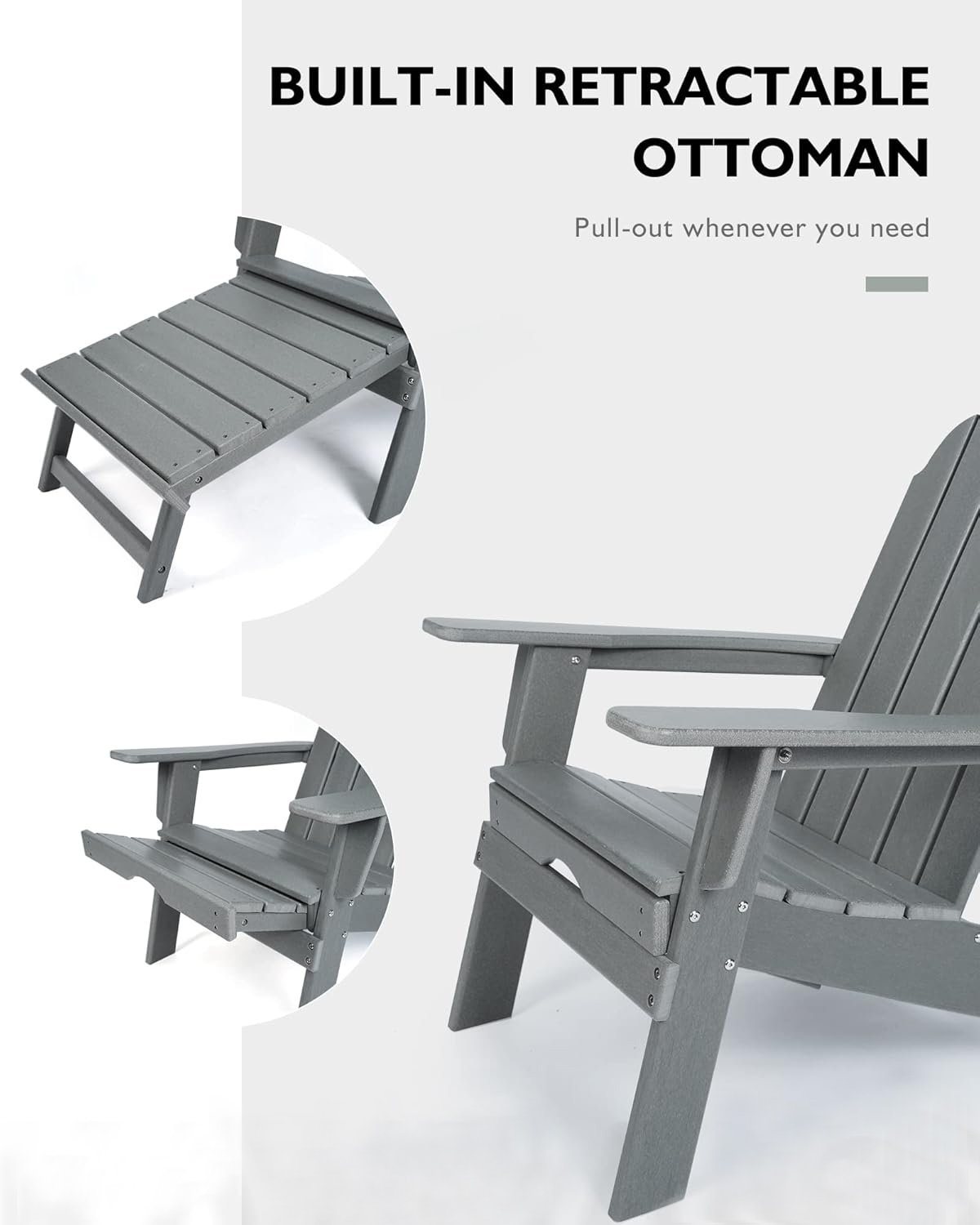 Relax in ultimate comfort with our HDPE Adirondack Chair with Ottoman set. Crafted from 100% High-Density Polyethylene (HDPE), this durable duo is built for endless outdoor enjoyment. The wide, contoured Adirondack chair with ottoman provide perfect support for your entire body, inviting you to unwind completely. Designed to thrive in any environment, the weather-resistant HDPE material defiantly resists fading, moisture, cracking, and rot. This zero-maintenance set is perfect for creating a serene retreat in your garden, on the patio, in the backyard, or by the swimming pool. Its timeless design adds classic charm to your outdoor decor, while its robust construction ensures it remains beautiful and functional for years to come, without any painting or staining required. Invest in lasting comfort and style for your outdoor living space.